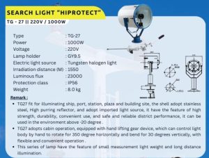 Lampu Sorot Search Light TG27 merupakan produk lampu sorot yang lapisannya terbuat dari stainless steel berkualitas baik, begitu juga dengan kualitas kaca kap lampu, dasar aluminium. Sudut Lampu 30 derajat yang menyesuaikan 350 derajat horizontal dan dilengkapi joy stick. Cahaya Pararel-Beam, Pencahayaan jarak jauh dan cahaya terkonsentrasi.